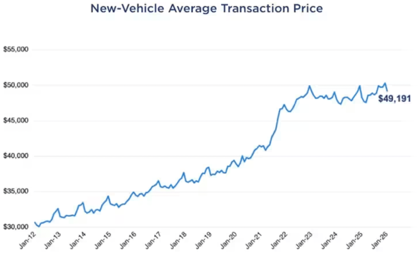 Kelley Blue Book puts the average new-car price at around $50,000 over the last few months, with used-car prices just over half that ($25,333 as of January).